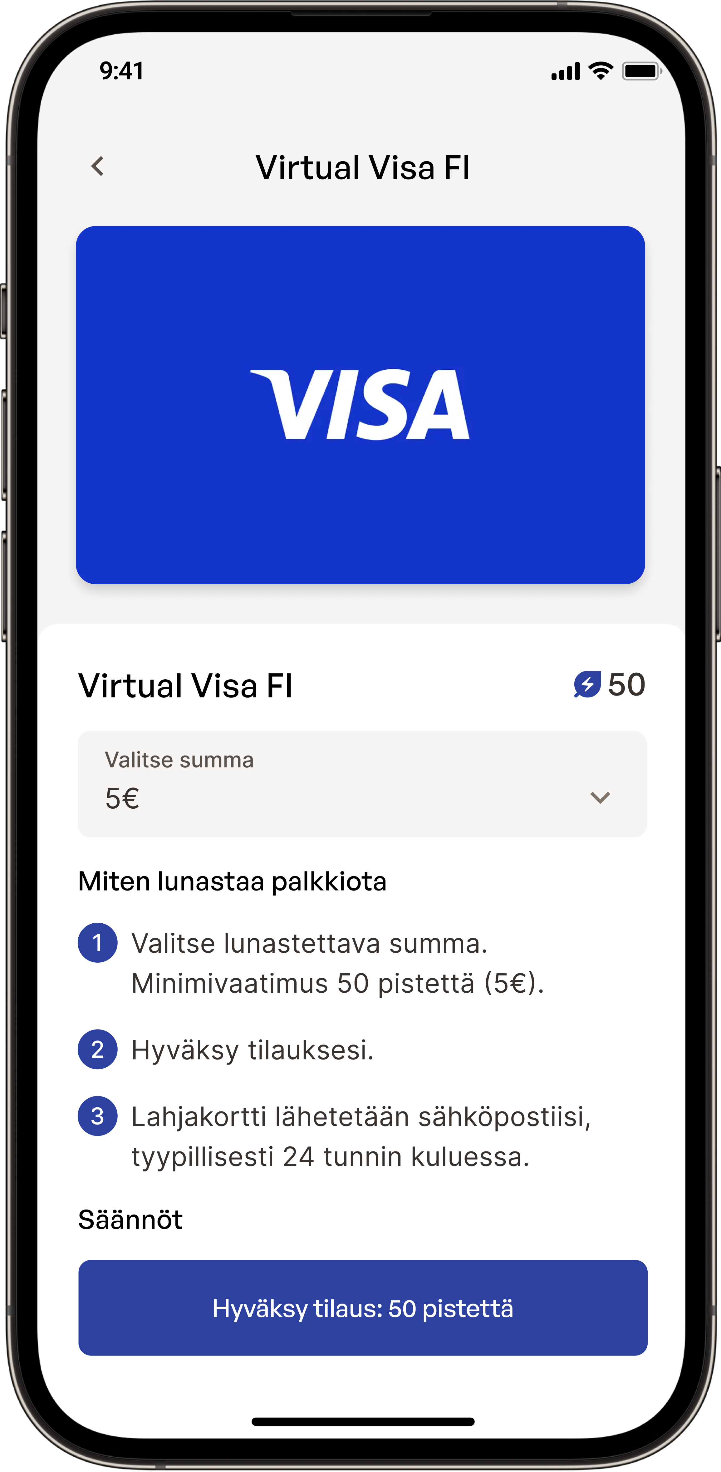 Lahjakortin lunastamiseen tarvitaan vähintään viiden euron edestä pisteitä. Suurin osa käyttäjistämme saavuttaa tämän rajan noin kerran kuukaudessa!